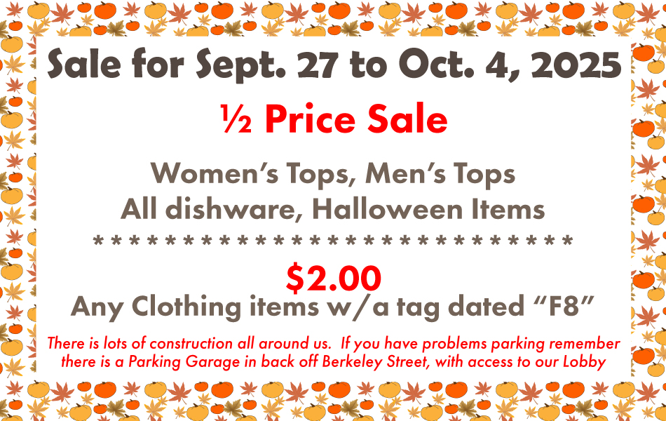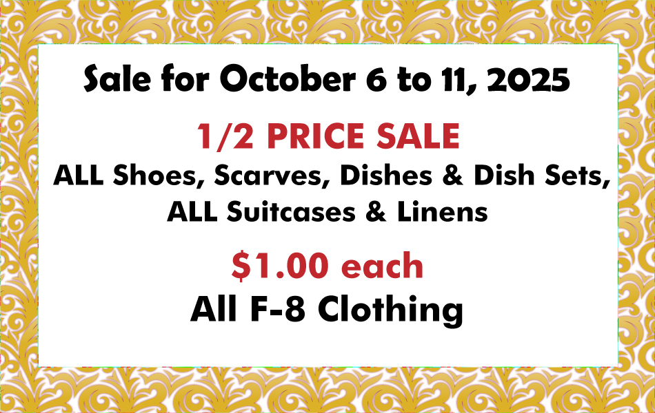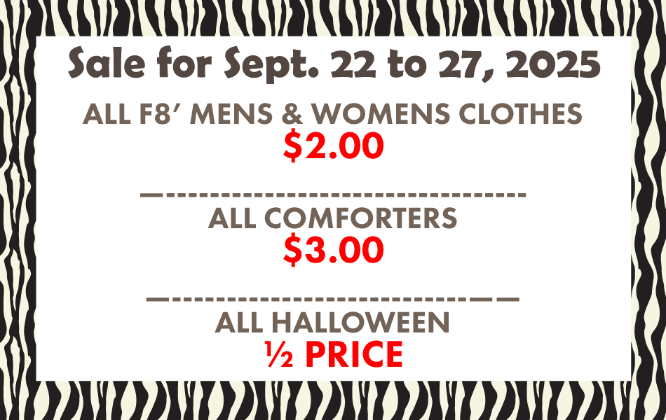 Sales for September 22 to 27, 2025 $2.00 -- ALL F8’ MENS & WOMENS CLOTHES $3.00 -- ALL [...]