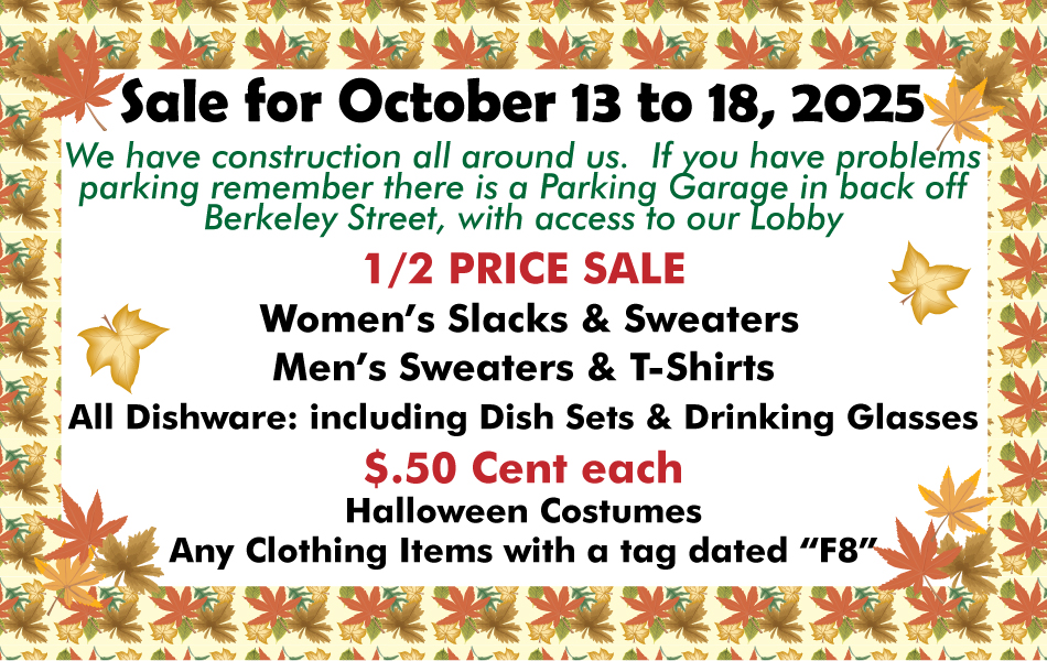 Sales for October 21 to 26, 2024 1/2 PRICE SALE WOMEN'S PANTS ALL MEN'S & WOMEN'S SWEATSHIRTS $1.00 [...]