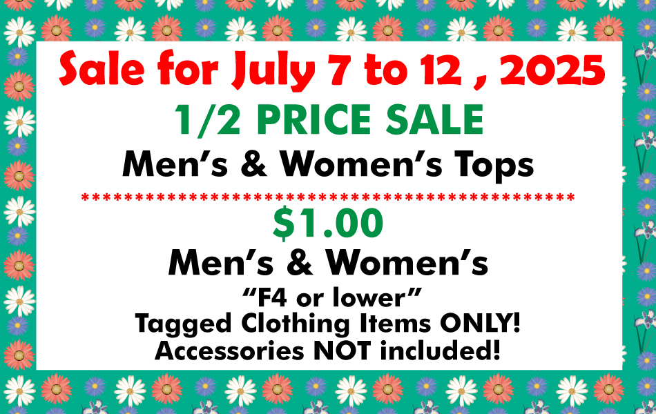 Sales for July 7 to 12, 2025 ½ Price Men’s Tops Women’s Tops ****************************** $ 1.00 Men’s and [...]