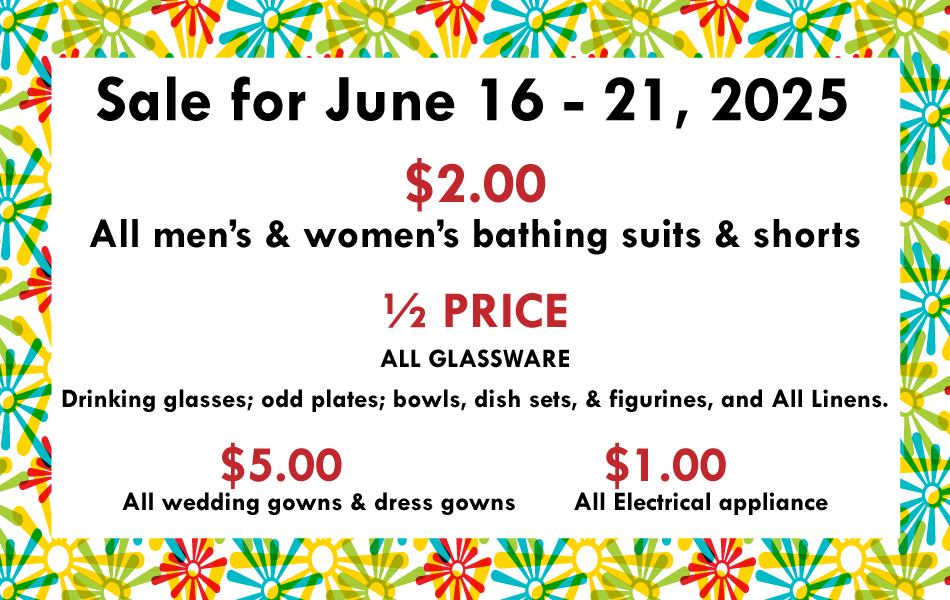 Sales for June 15 to 21, 2025 $2.00 Sale All Men's & Women's Bathing Suits & Shorts ------------------------------------------ [...]